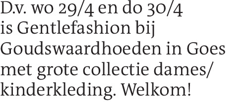 D.v. wo 29/4 en do 30/4 is Gentlefashion bij Goudswaardhoeden in Goes met grote collectie dames/ kinderkleding. Welkom!